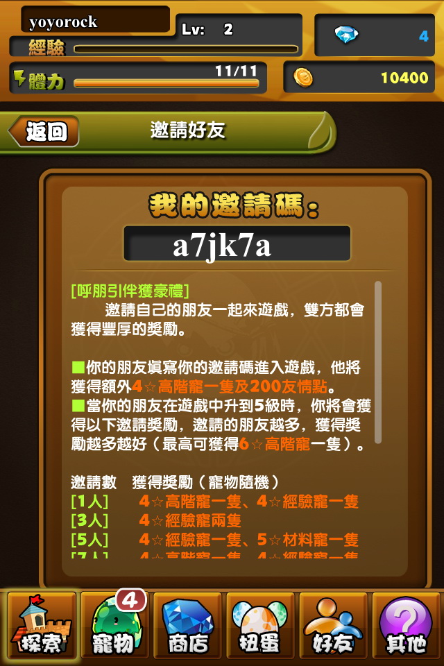 玩家首次登入時登錄邀請碼,可獲得4☆高階寵一隻及200友情點!當使用玩家邀請碼的朋友在遊戲中升到5級時,玩家將會獲得邀請獎勵,邀請的朋友越多,獲得獎勵越多越好,最高可獲得6☆高階寵一隻。