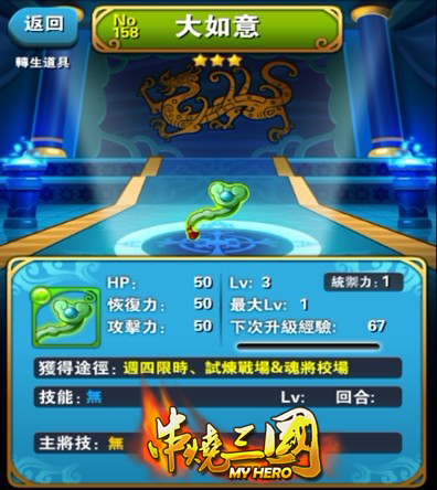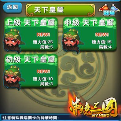 串燒三國》遊戲核心之一,武將星數越高,強化的難度越高,除了武將等級提升以外,必須要有相對應的材料才可進行強化;此次推出的「天下皇璽」戰場,共分為上、中、初三個等級,關卡可重覆進行挑戰,每場關卡所需的體力值與難度隨著關卡等級增加,而透過通關「天下皇璽」戰場,有機率可以取得帶有大量經驗的金令與玉璽,若您苦於缺乏素材,「天下皇璽」是您不可錯過的必通關卡。