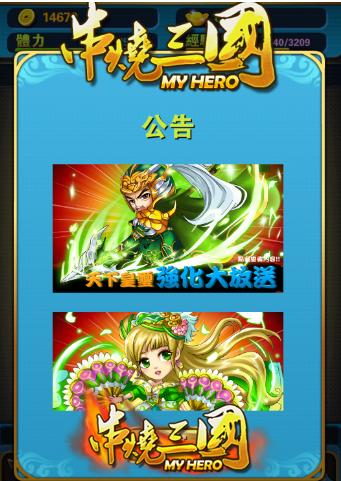 串燒三國》的玩家們都有留意到,近來登入遊戲時,密密麻麻的公告文字不見了,映入眼簾的是一張張可愛武將人物圖片,這種不同於其他遊戲公告的呈現方式,不但是手機遊戲界的獨創,最主要能夠讓玩家更容易掌握遊戲內現正舉辦的活動,只要想了解哪一則活動,從圖片點入就可一目了然,再也不需要從一堆文字中尋找,也是唯客科技回饋給玩家的一個小小禮物唷!
