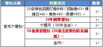 【活動內容】:於活動時間內,首次儲值即可獲得大禮包一份!