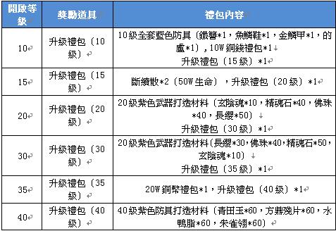 【活動說明】:即日起,各位名將達到相應的級別就會獲得我們送出的貼心禮物, 它們會讓您更快的成長喔!