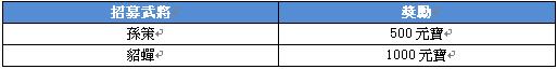 【活動規則】:玩家招募到名將“孫策”,“貂蟬”後即可獲得相應的元寶獎勵