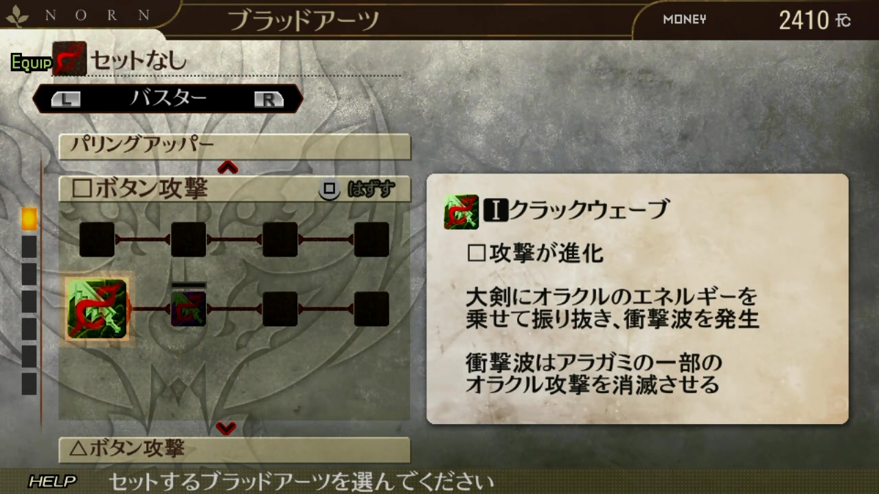 血戰技藝基本上為額外附加的被動效果,例如長刀的「斬鐵」血技,使用 □ 攻擊的第四刀會變成收束能源的集氣攻擊。短劍裝備「神縫い」 ,在空中的 △ 攻擊會變成快速向下突刺,對於弱點在背部的「荒神」特別好用。