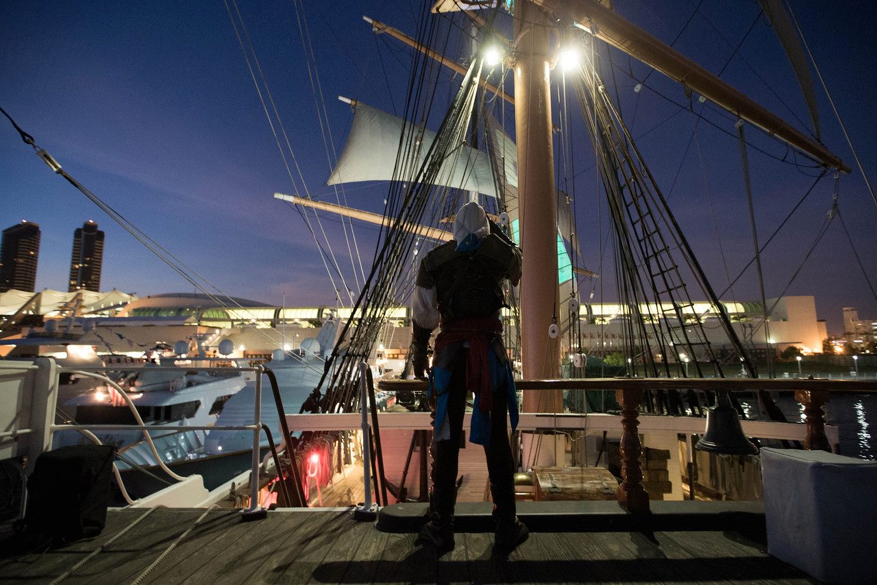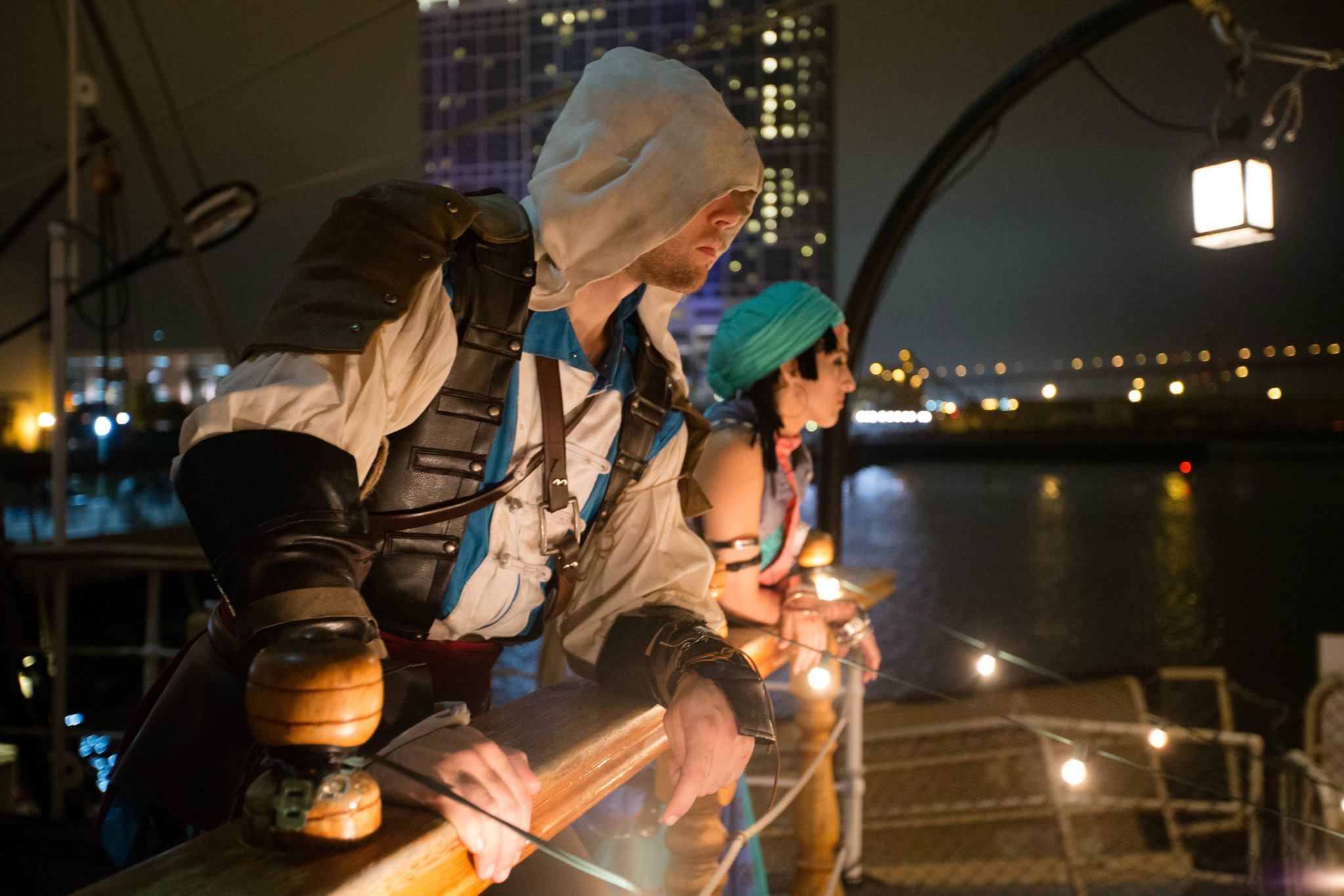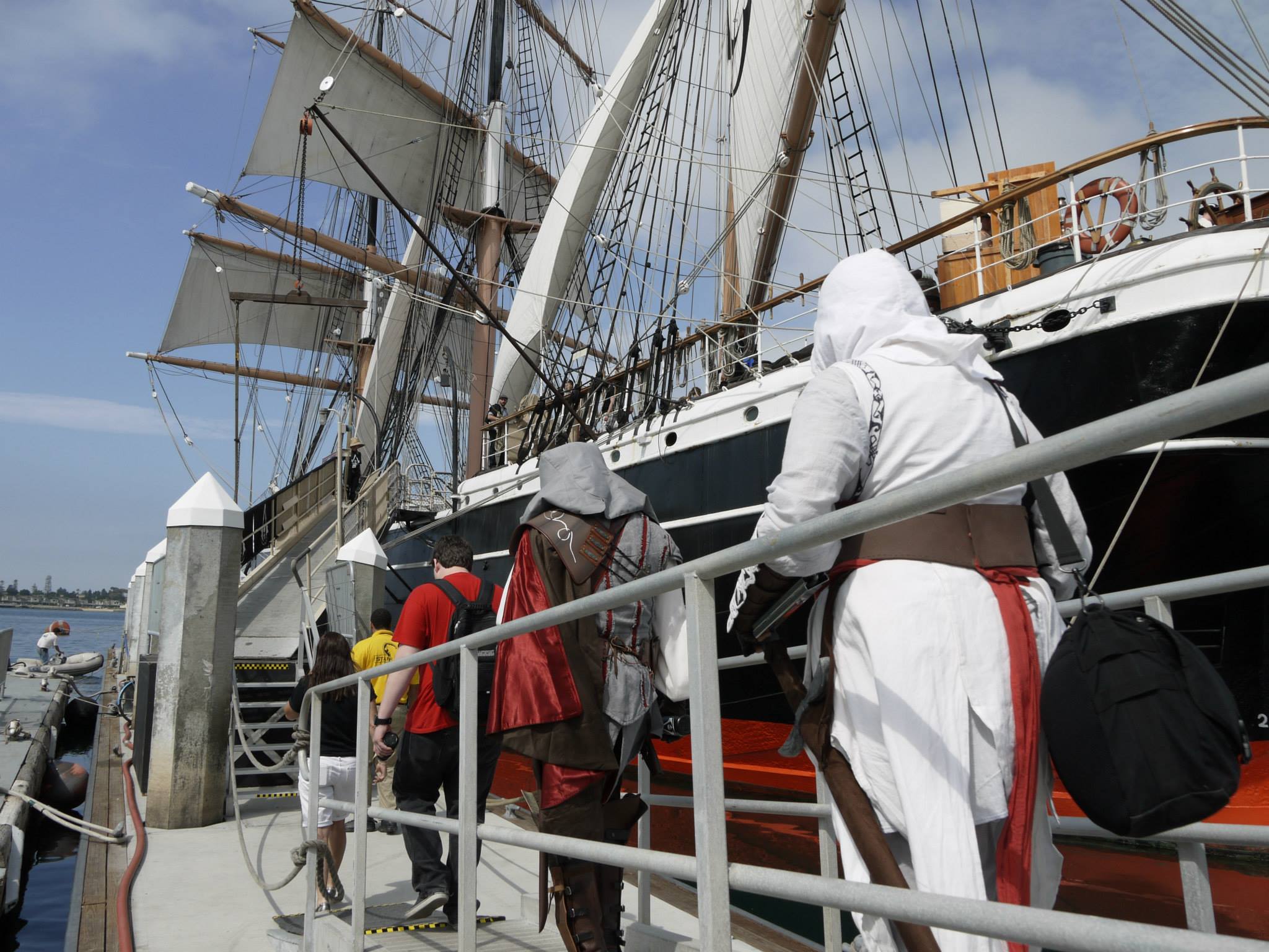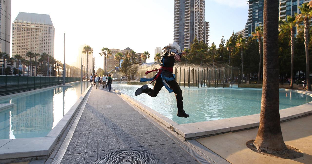 全美各地許許多多《刺客教條》系列 Cosplay 玩家也利用這個機會在這場盛會中大會師,知名 YouTube 影片導演 Devin Graham 帶來了最新一代《刺客教條 4:黑旗》真實版跑酷影片,不過這回登場的不是過去曾多次合作拍攝《刺客教條》真人跑酷影片的 Ronnie Shalvis、而是由另名跑酷好手 Chris Romwell 來扮演這一代的全新刺客角色,穿梭在聖地牙哥街頭並登上 Ubisoft 在「寒鴉號」上所舉辦的派對活動。