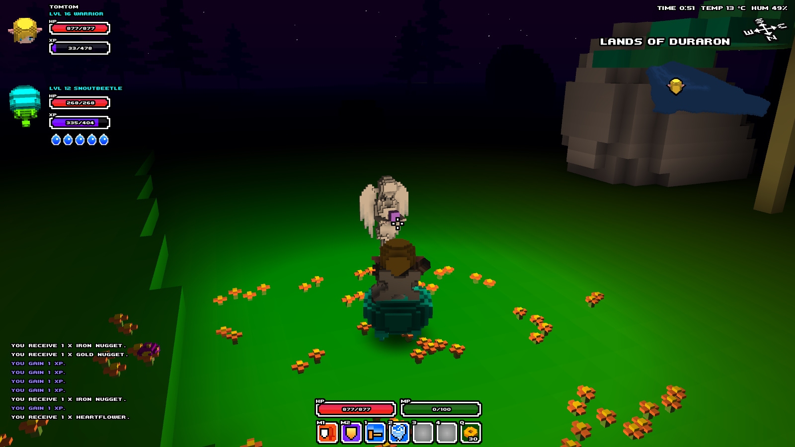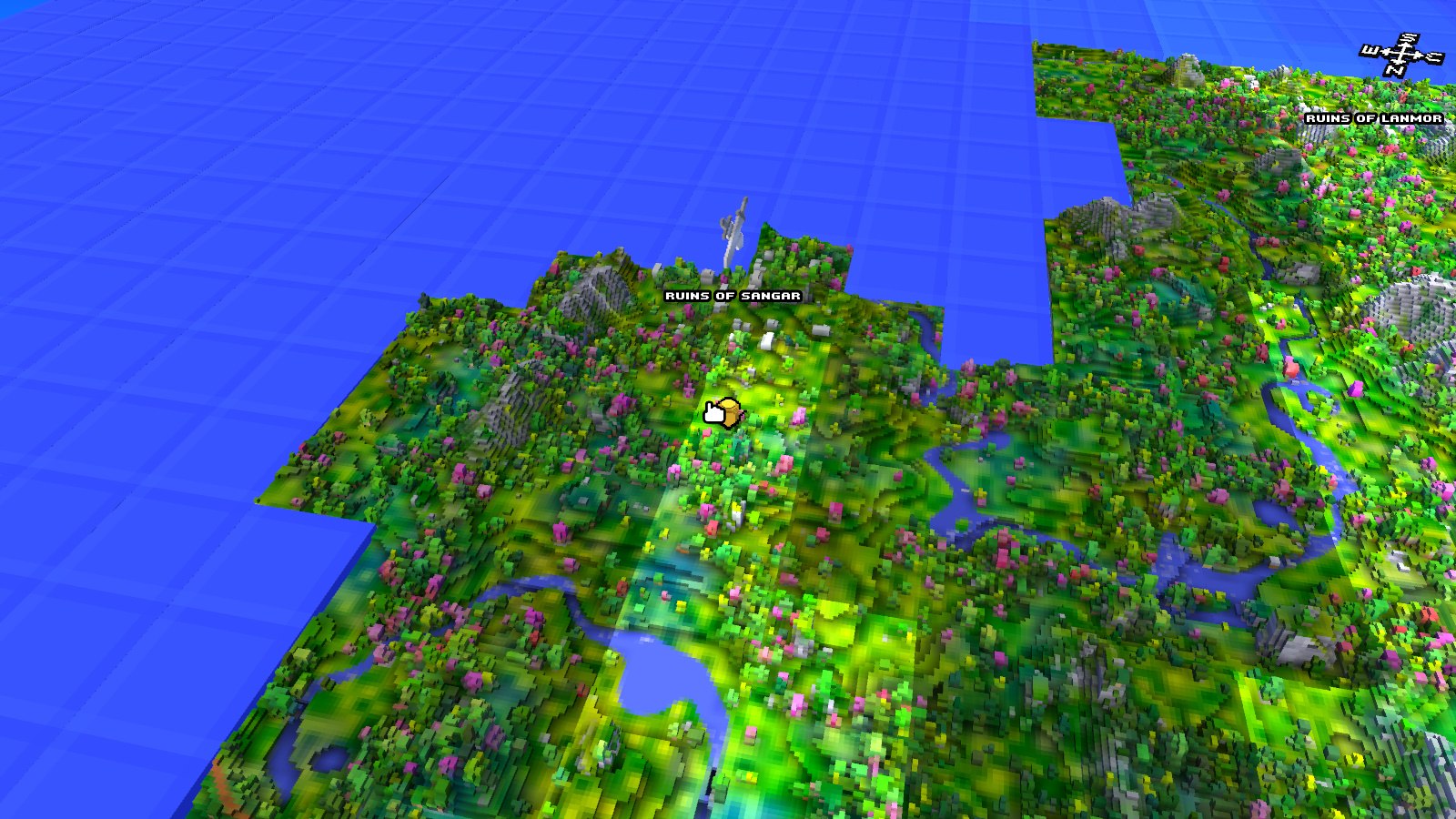 雖然是隨機產生的地圖,不過並不會是空洞乏味的無意義組合,而是包含了有 NPC 販賣物品的城鎮、藏有許多礦產的洞穴、或是有 BOSS 鎮守的地城等。讓整個遊戲世界不只是遼闊,同時也有許多值得一探的地點。