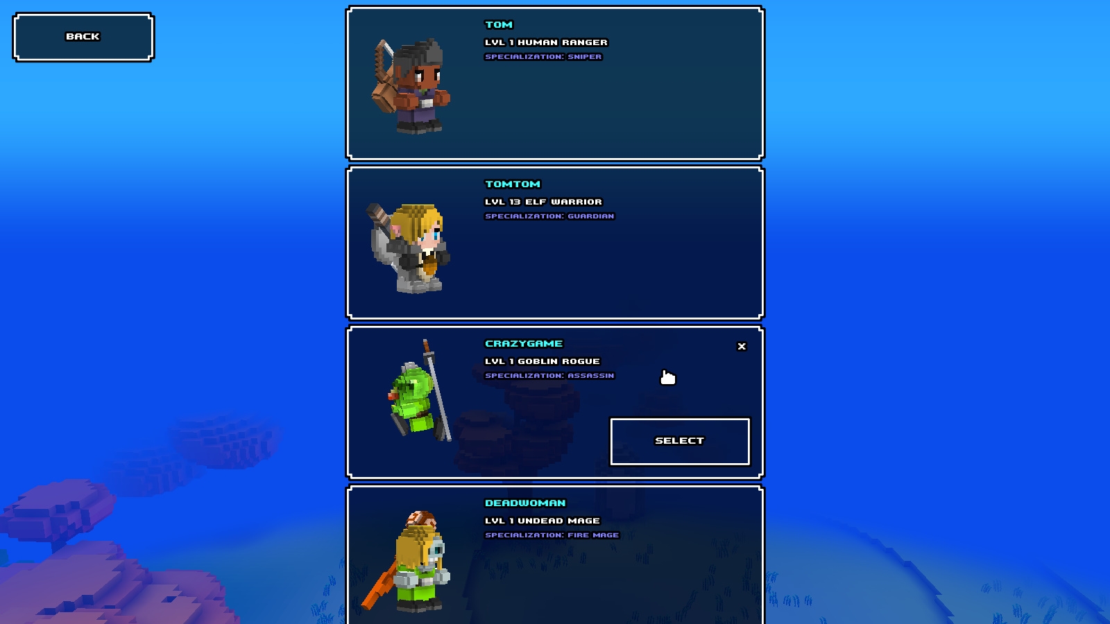 Cube World 》設計了戰士、法師、盜賊和遊俠這四種職業;而種族方面則有人類、精靈、矮人、不死族、蜥蜴人、甚至是青蛙人等供玩家選擇。四種職業的戰鬥方式差異頗大,且每個職業還有兩種不同專精,像是戰士就分成狂戰士和守護者,這兩種分別代表攻擊和防禦的形態。