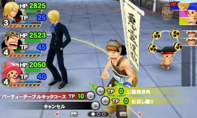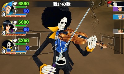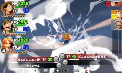 在本作的戰鬥中,有特技以及屬性相剋跟狀態異常等要素。特技部分有魯夫(ルフィ)以檔(ギア)來強化自己,透過布魯克(ブルック)的歌來強化我方所有人,以及喬巴(チョッパー)的恢復等這些角色獨有的特殊能力。