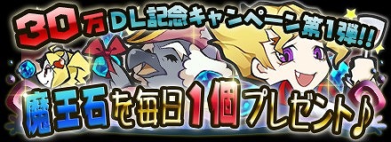 在 30 萬次下載突破紀念活動第一波當中,將要舉行只要每天登入就可以得到魔王石的活動!請藉由這個機會來獲得魔王石,使遊戲能更有利的進行吧!