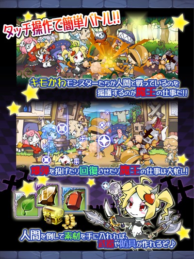 魔族的時間(まぞくのじかん)》。本作是一款讓玩家扮演見習魔王「亞媞(アーディ)」的 RPG,遊戲中玩家可以指揮擁有各種特殊能力的怪物軍團擊潰人類。另外,為了紀念 iOS 版的下載次數突破 30 萬,將從 8 月 9 日到 8 月 13 日的期間內舉行 1 天可獲得 1 個魔王石的登入獎勵活動。
