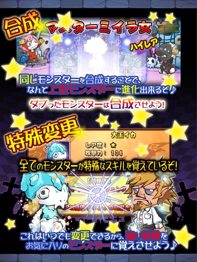 1 日 1 次登入時都能獲得一顆魔王石。收集魔王石一定數量的話,除了可進行一定可得到稀有以上怪物的魔王石召喚之外,也可以擴張鍛冶屋的製作欄位跟怪物保有格的。