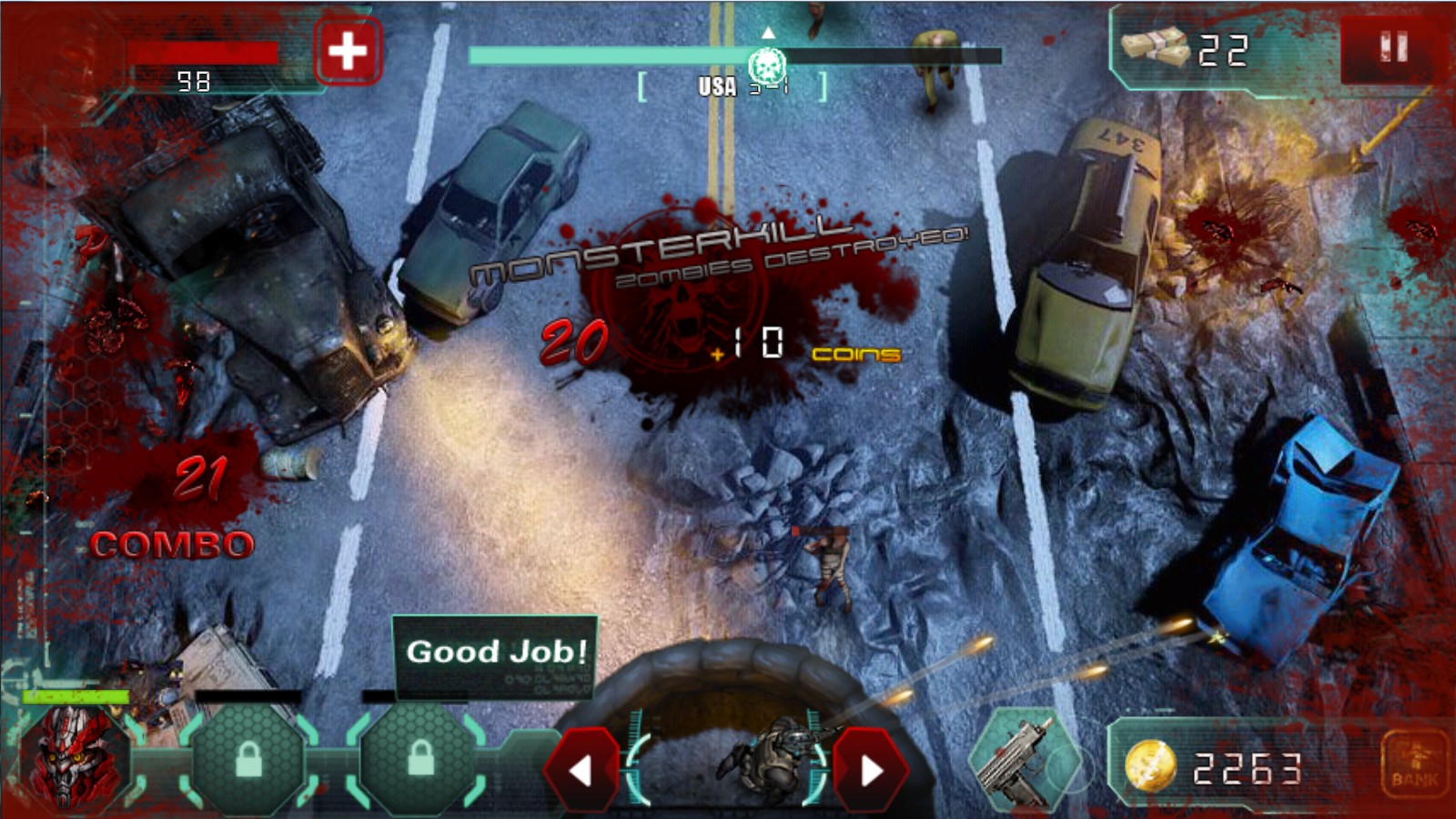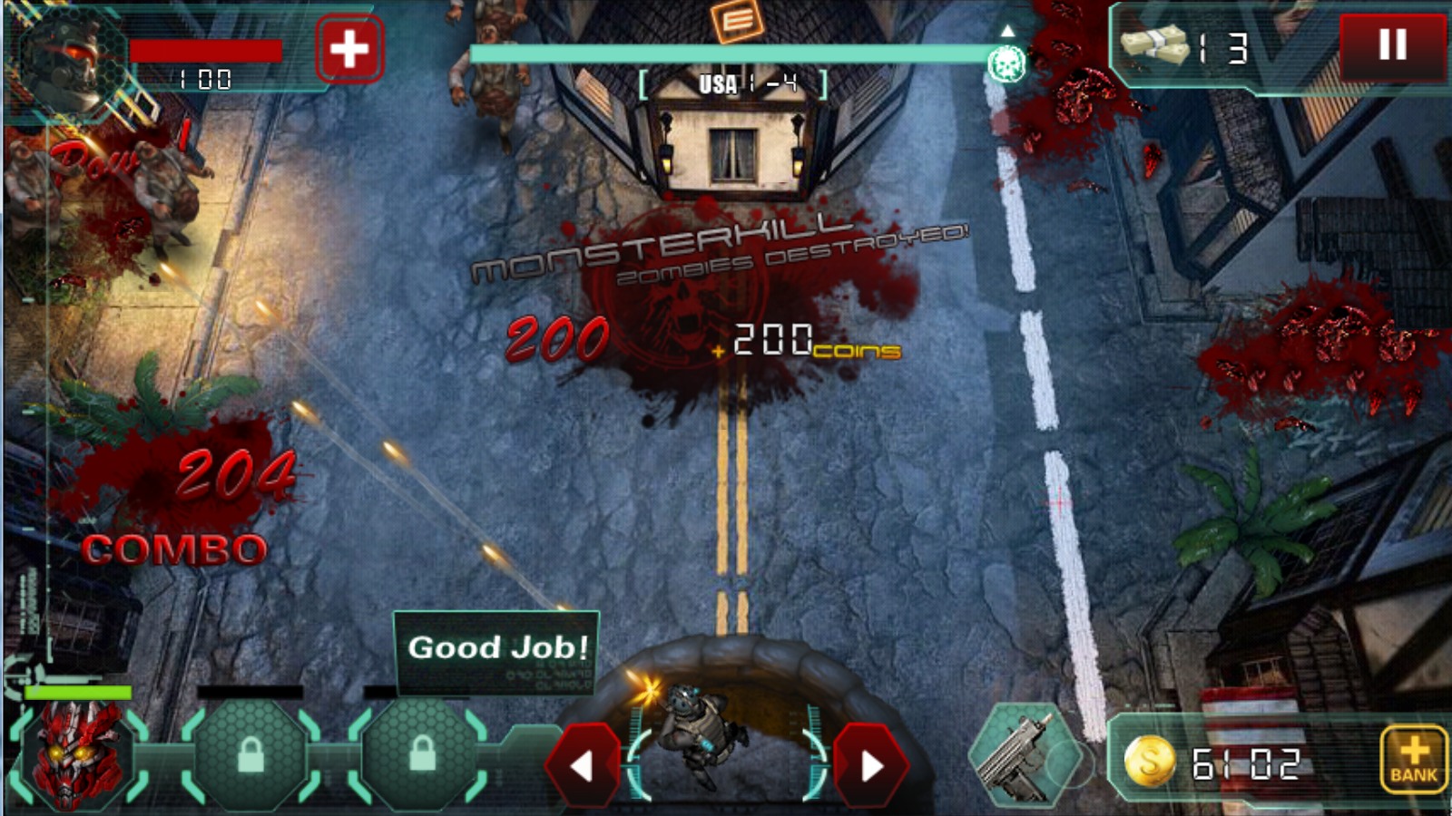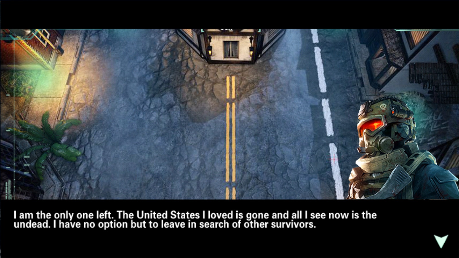 在剛進入第一關的時候,主角便會簡單介紹一下故事背景與現況,簡單來說就是-美國已經淪陷了,現在身為倖存者的主角,眼前所見盡是滿山滿谷的殭屍,因此主角必須殺出一條血路,好尋找其他的倖存者。