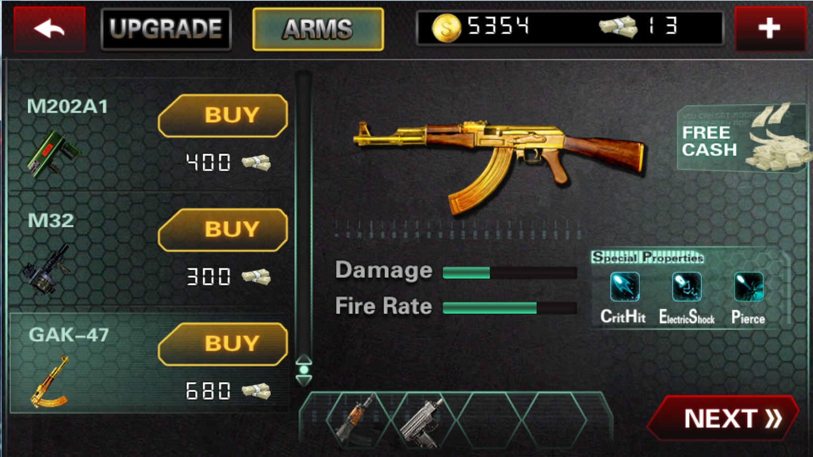 過關後,玩家將可獲得金幣作為獎勵,金幣可購買武器、亦可用以升級技能。本作中的武器類型算是挺豐富的,從烏茲衝鋒槍、霰彈槍、到榴彈槍,甚至是「殭屍剋星」火箭筒都應有盡有,不過這些武器可是要價不菲的,除了攻擊力與射速外,某些武器亦具備了不同的「武器特性 (Property)」,像是霰彈槍系列通常都具備「擊暈」效果、而步槍系列則帶有「爆擊」或「穿刺」效果,玩家可參考這些特性作為選購武器的依據。