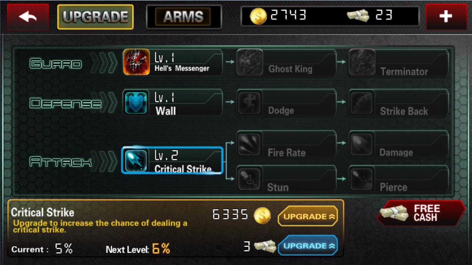 而在技能樹方面,則分為守衛 (Guard)、防禦 (Defense) 與攻擊 (Attack) 三種。守衛其實就是輔助武器,玩家可在此投注點數以學習強化「地獄使者」、「鬼王」、「終結者」三種效果不同的手榴彈;防禦系技能則偏重於強化陣地、提升耐久度;而提升攻擊系技能則能夠提升爆擊率、攻擊傷害、或是強化擊暈、穿刺等效果。由於升級技能的花費實在高得驚人,因此玩家可先依照自己的風格來選擇優先提升哪類的技能。