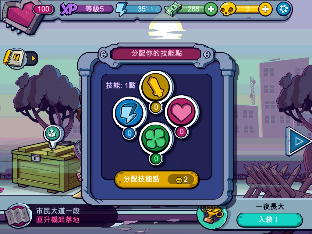 遊戲有階段性的關卡設計,依照玩家在過程中的表現,像是殺除的殭屍數量,角色的死亡次數等,過關後也會給予玩家 A、B、C 等評價。隨著玩家進度推進,遊戲中也能解鎖更多的地區,另外也有一些成就在完成後就可獲取經驗值或金錢等獎勵。