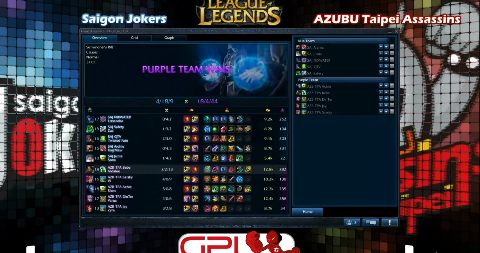 GPL 夏季賽賽季於上周日晚間順利落幕,霸主 ahq 在強敵環伺的威脅中,仍勇突逆境,拿下兩勝,成功穩住夏季冠軍威名,將於 8 月 29 日與同為台灣隊伍的春季賽冠軍 AZUBU 台北暗殺星一同在台北小巨蛋爭奪 2013 GPL 總冠軍,對戰經驗豐富的彼此,將為賽事增添更多看頭,讓我們一起持續關注,拭目以待!