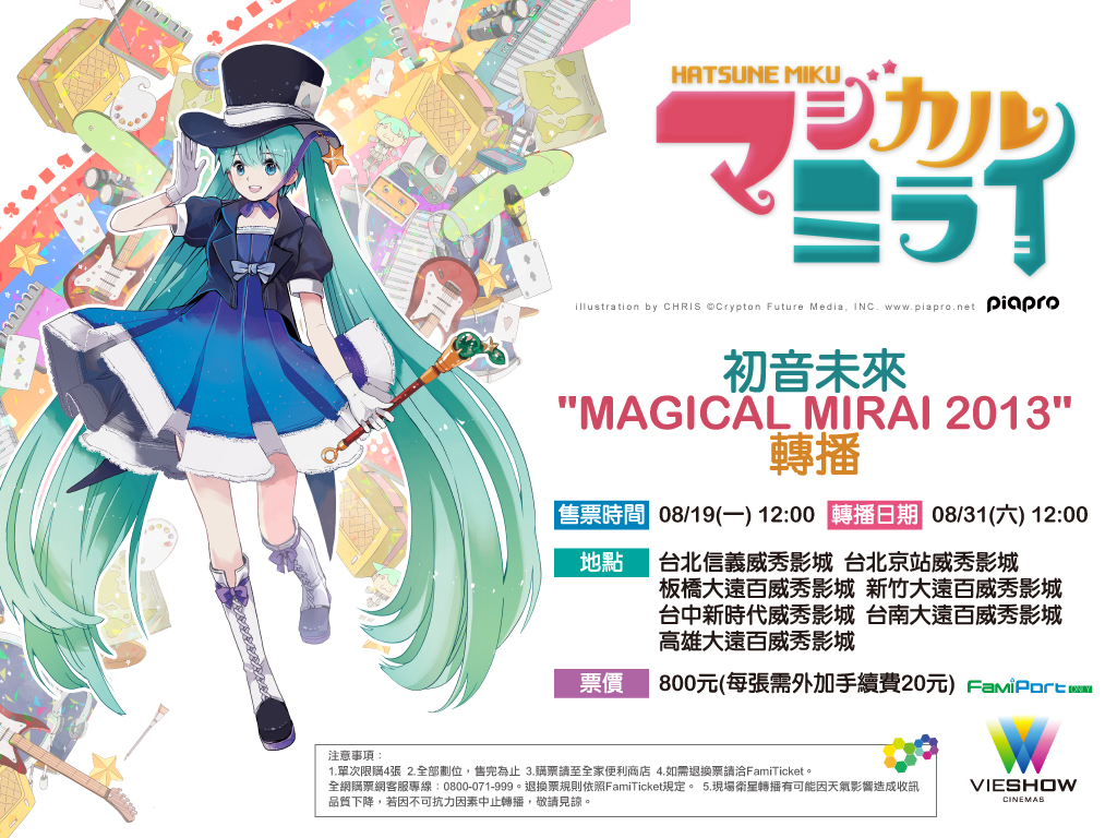 初音未來「MAGICAL MIRAI 2013 橫濱演唱會」將於 8 月 30 日舉辦,而在活動隔天(31 日)也將於台北、新北市、新竹、台中以及台南威秀影城轉播,台灣官方並公開了相關的購票資訊。