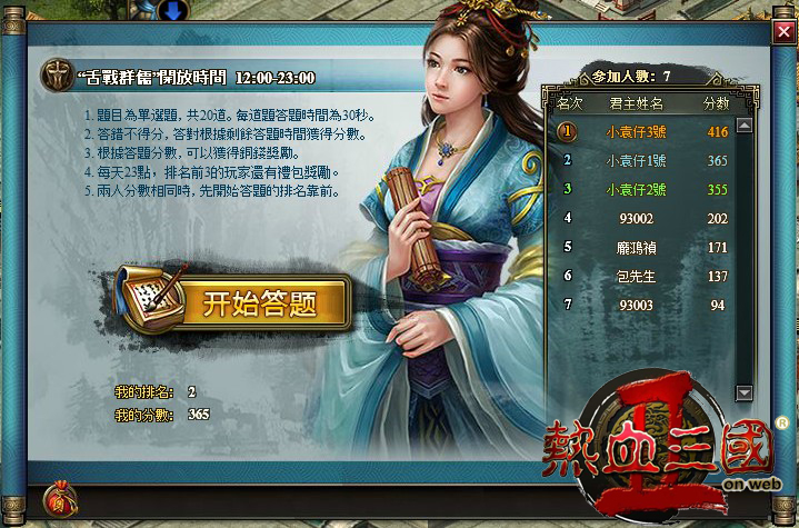 只要玩家等級達到 20 級,每天 12:00 至 23:00,可以點擊界面的【舌戰群儒】按鈕進行參與。據玩家的答題分數,發放銅錢獎勵。每天排名前三名的玩家,還有額外的禮包獎勵。另外,參加的玩家一律皆可獲得參加獎,此外系統還會隨機選出幸運玩家,特別額外贈送禮金唷!
