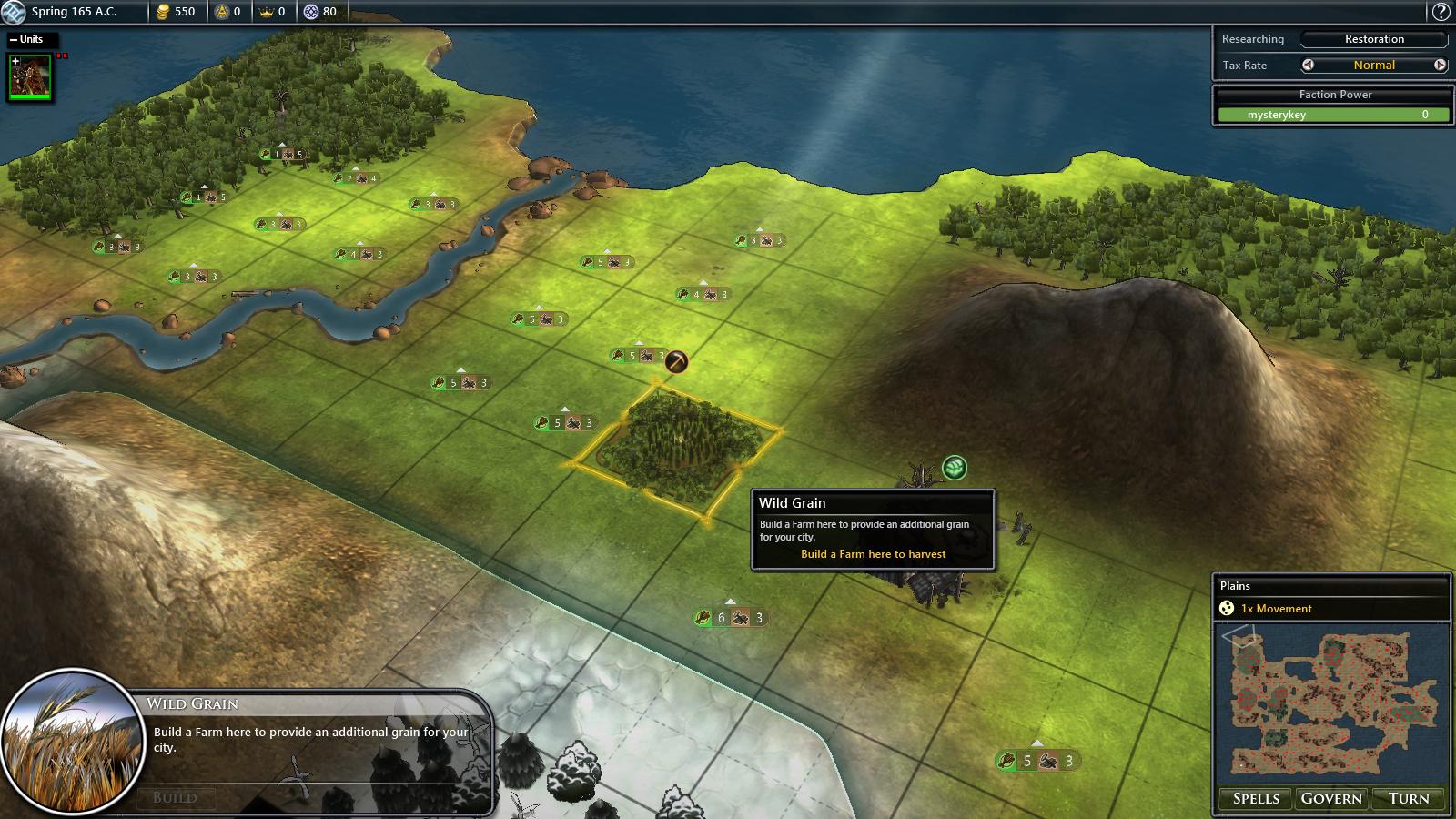 能興建農場和果園增加城市糧食產出。糧食是維持人口成長的重要資源,人口充足的都市才能專業化,專業化後會解鎖對應建築、特性而增強國力。
