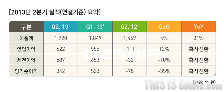 NCSoft 於 8 月 14 日 2013 年第二季業績發表會表示,與 2012 年第二季相比營收增加 31%,營業利益也由赤字轉成獲利。