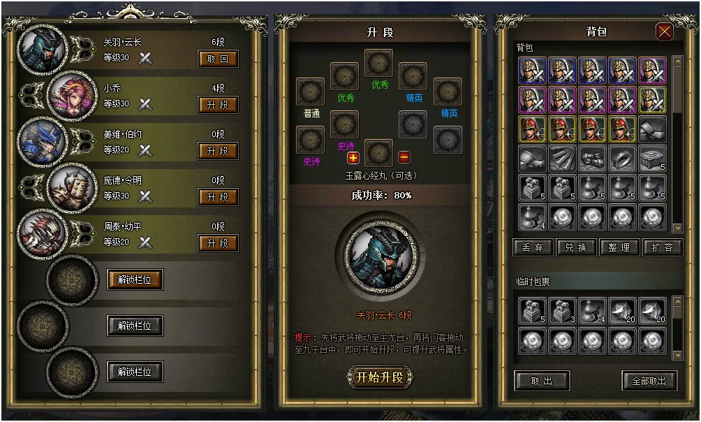 升段:於主城 14 級時開啟,升段能夠提升武將屬性,且武將升段基本不受等級限制,。可以在低等級的階段,使武將擁有極大威力,作用不可小覷。武將升段需要消耗門客,升段的段數越高,所需的門客數目越多且門客的級別越高。隨著段位的升高,升段的成功率會逐漸降低。
