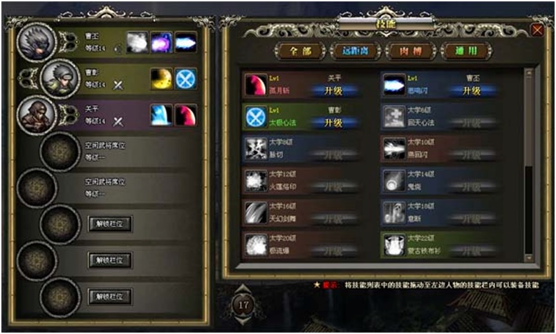 亂世求生需要一技在身,再強悍的武將若只會你一刀我一刀的互砍,是很難贏得戰役的。所以身為主公的玩家們要將武將們送入太學,學習各種強悍的技能,才能夠在戰場上大放異彩,戰無不勝!