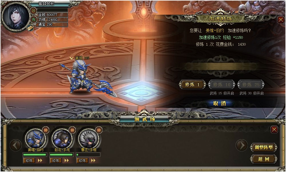 修煉:於主城 3 級時開啟,修煉可使武將屬性提高,增強武將實力。每次修煉,需要 10 小時才能成長 1 級,武將修煉至 5 級可以開啟武將專屬的必殺技,可以說是武將們的必修課程。