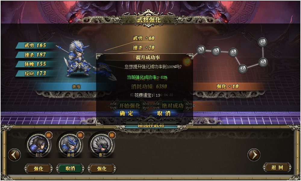 強化:於主城 5 級時開啟,武將可以消耗功績來強化自身屬性,當強化每加 10,即可點亮一顆星,屬性會有大幅度的增加。要注意的是,系統每半小時會刷新一次強化屬性的成功率,玩家要隨時注意。