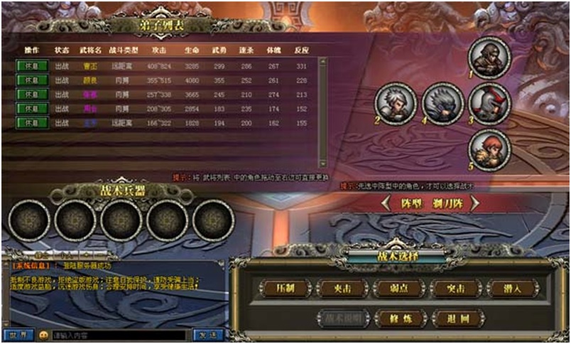 調整陣型:於主城 10 級時開啟,初始可免費習得燕羽陣和大雁陣,想要學習其餘陣型則需消耗功績開啟。根據武將遠距離或肉搏的類型以及其技能特點,安排位置,可揚長避短,在與對手實力相當或有微弱劣勢的情況下,可以巧取勝。