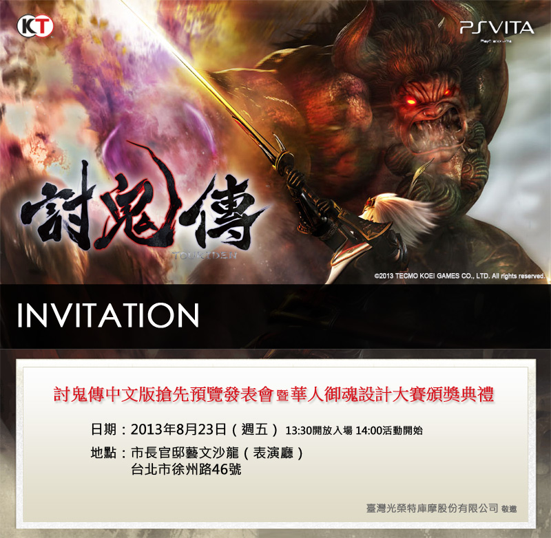 臺灣光榮特庫摩宣布,將於 8 月 23 日(五)在台北市長官邸藝文沙龍舉辦「討鬼傳中文版搶先預覽發表會暨華人御魂設計大賽頒獎典禮」。現場特別邀請到《