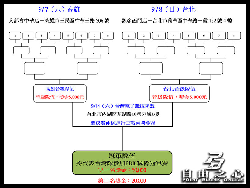 自由之心》的優秀選手,華義特別舉辦【2013 PBIC 國手選拔賽】,報名網頁今日 (8/20) 即刻上線!將於 8/23(五)15:00 開放報名,每報名隊伍包含五名正式成員與一名後補。選拔賽開打時間為:9/7(六)高雄、9/8(日)台北,決賽日期為:9/14(六)。