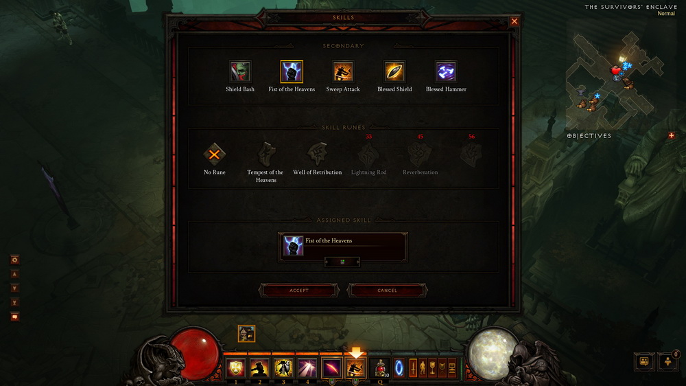 聖教軍被設定為中距離戰士角色,擅長使用盾牌與槤枷,並消耗怒氣值。現場角色除了可以用盾和武器進行接連的普通攻擊外,還可以體驗到的技能像是護盾炫光( Shield Glare,以下所有技能、魔物名稱都為暫譯,正式名稱以官方為準),那是一種利用天堂的能量反應在盾牌上來致盲敵手的技能,還有奉獻(Consecration)就是施展時會在地上畫出一個圈圈,然後來治癒隊友並且會產生聖火對靠近的敵人造成傷害的技能,等於就是在 AOE 範圍中同時治癒隊友並傷害敵人。勇氣之律(Laws of Valor)當玩家對敵手使出致命攻擊時,就有機會為所有人創造更多傷害的好處。而當年玩家熟悉的天堂之拳技能再度出現,而天降神劍(Falling Sword)看起來像是天堂之拳概念延伸,聖教軍可以使用神聖的力量從遠方降下如