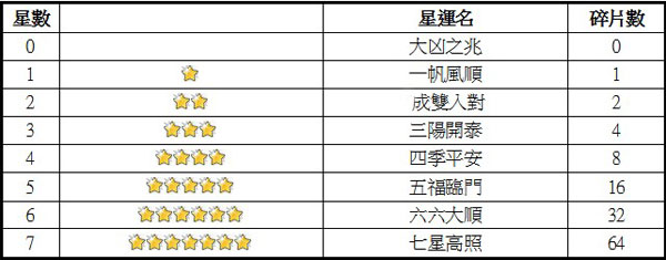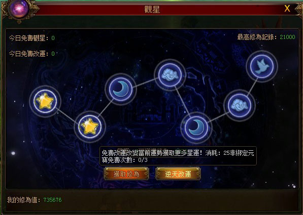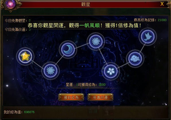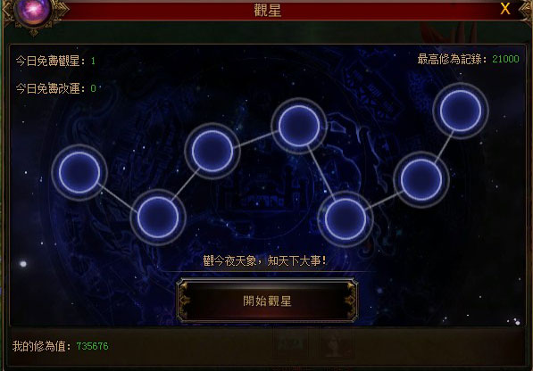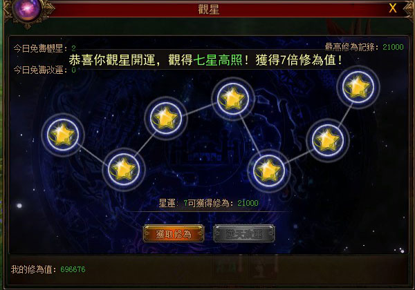 在運氣觀星時,七大星位上出現的星星越多,則玩家的運勢越喜旺,同時占星所得修煉獎章碎片數量也將越多,玩家集齊一定的碎片便可前往兌換橙色裝備與修煉獎章,借星運成就稱霸大荒的野心!