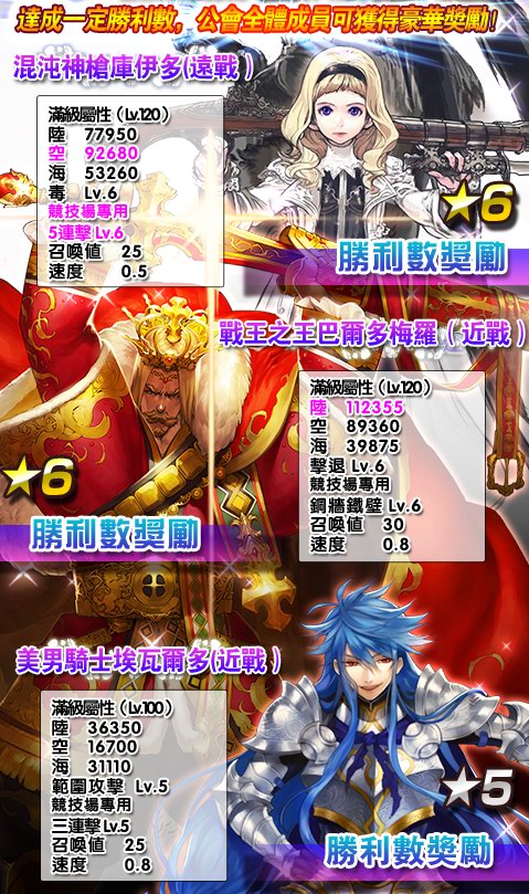 加入或創建公會,召集小夥伴們參與公會戰,不僅可獲得連續參展獎勵,有機會獲賞扭蛋禮券,更會按累計勝利數給予額外獎勵,獲6★稀有卡牌。