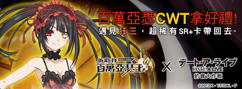 百萬亞瑟王》營運團隊將帶同獎勵到「台灣同人誌販售會台中場」與大家見面!不論大家有沒有參加「FF22」、「ACGHK」、「漫博 14」都歡迎各位亞瑟來到 CWT 台中場共襄歡樂!現場更隨時有 Coser 現身,參與活動即送 AP 藥水、BC 藥水及轉蛋卷!好康活動不容錯過!!