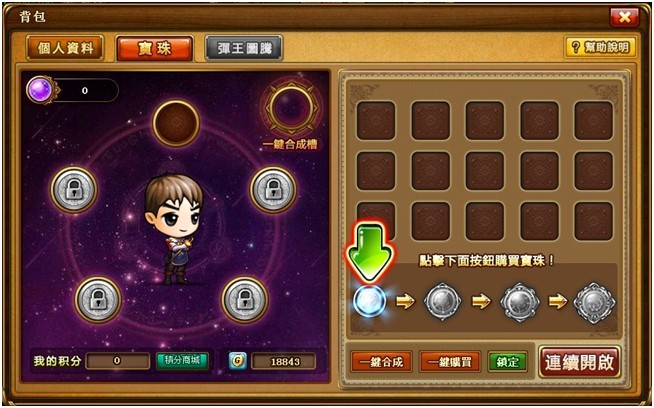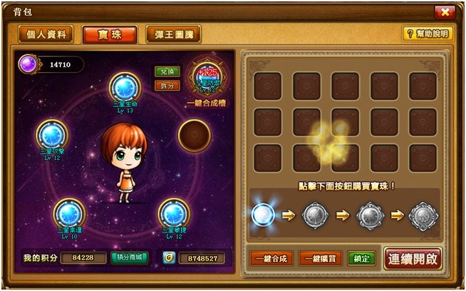 玩家經歷過探險副本及主線故事後,將擁有第一筆的金幣數量,這時候可立即將金幣轉換成寶珠,為自己的戰鬥力加分。寶珠共分成五類:攻擊寶珠、防禦寶珠、幸運寶珠、敏捷寶珠、生命寶珠,由於更高等級的寶珠需要更多的金幣支援,因此玩家不要忘記到遊戲大廳進行對戰,來賺取更多金幣,才能升級到更高等級的寶珠!