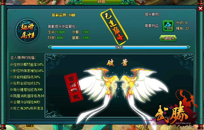 玩家在進入武勝界後,除了會有先前介紹過的美女俠客相伴外,還會得到俠客專屬法寶翅膀,翅膀可以隨著遊戲的進行,並透過專屬寶物進行進化,展現更多更炫麗的造型外觀,同時也會有更多的能力來加成幫助俠客跟玩家在戰鬥中更輕易地擊敗敵人,且在玩家與俠客進行合體時,獲得更多的戰力加成。