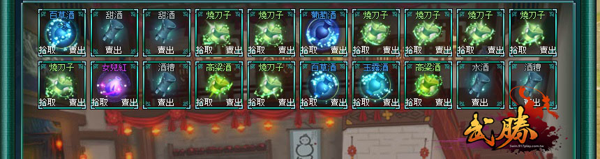酒館一向是武林小說中不可或缺的一個場景,武勝界的酒館,除了可以打探消息外,還有各種奇人異士隱藏其中,透過與這些豪傑們拚酒,大家們可以獲得凝煉酒魂的能力,酒魂有大家耳熟能詳的燒刀子、水酒外,也有奇人異士們採集珍稀材料透過特殊手法釀造出來的稀世名酒,酒魂共有白、綠、藍、紫、金五種品質區別。酒魂品質越好,屬性加乘就越好。酒魂相互吞噬可以提高酒量,酒魂的酒量是不會在吞噬中消滅的,可以無限繼承與傳遞,讓大俠永遠都可以擁有最強的酒魂陪你一同闖蕩江湖。