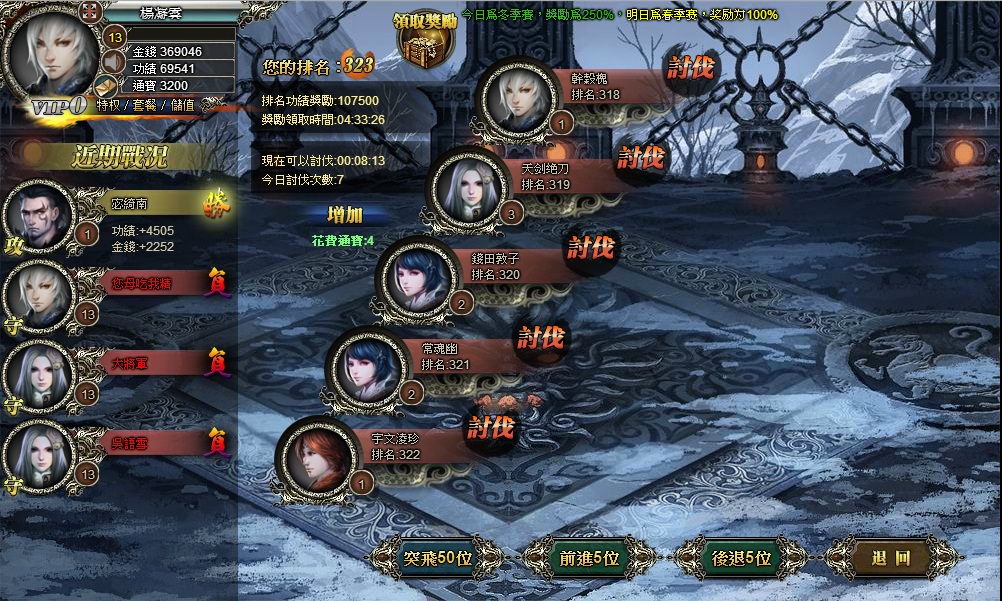 如果玩家有足夠的實力,建議玩家可以進入討伐頁面開始征伐之路,過關斬將和討伐都是費時較少又獎勵豐厚的賺錢方式,討伐不止贈送金錢,還有相對應的功績獎勵,是一個刷金刷功績的好地方。討伐賺錢較快,它和過關斬將一樣擁有一定的挑戰性和難度,如果戰勝排名高的玩家,獲得的金錢就越多。