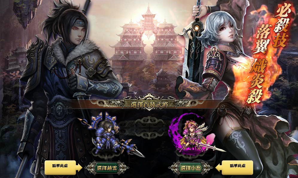 一進入遊戲,首先就能在兩名知名武將中選擇一名作為陪伴我們打天下的初始伙伴,分別為「少年趙雲」和「小喬」,兩名都各有自己專屬的特色及必殺技,都屬於近戰的角色,小編使用下來是覺得能力差不多,所以玩家們就選擇順眼的就行了。