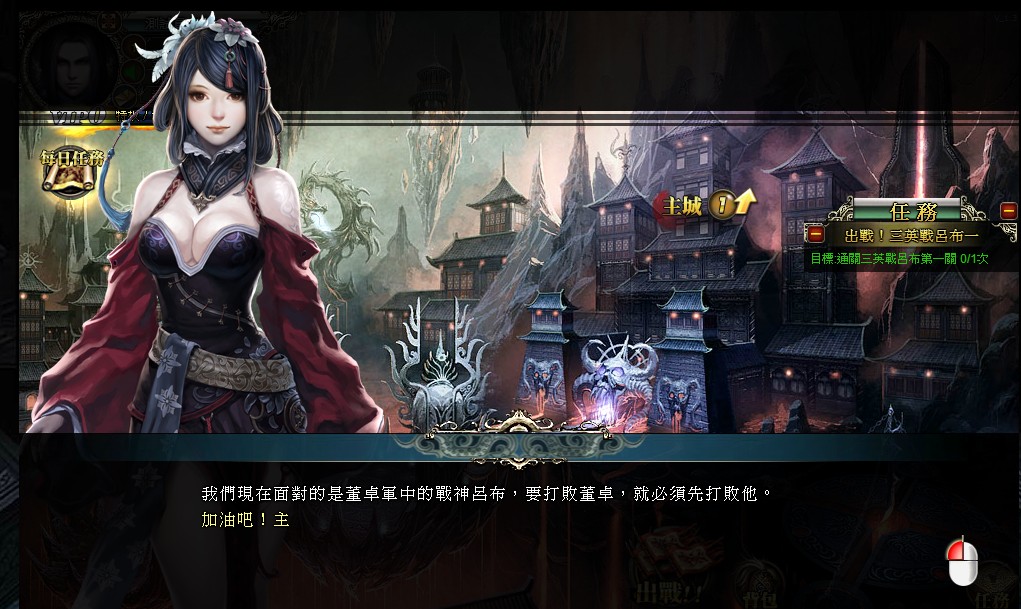 玩家一進入遊戲首先要面對的就是戰神呂布,要打敗他才能對上董卓,而透過美女指導員的帶領,玩家將會學會一些基本強化的操作。