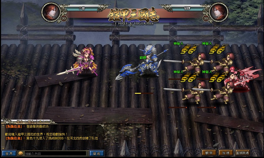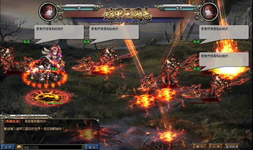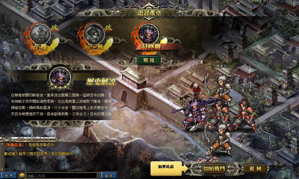 在歷經貂蟬的挑戰和一群檔路的雜魚後,終於遇上了混世魔頭董卓了。不過由於之前依照美女指導員的指示已經把武將和裝備準備好的我,打起來是毫無懸念的輕鬆過關。