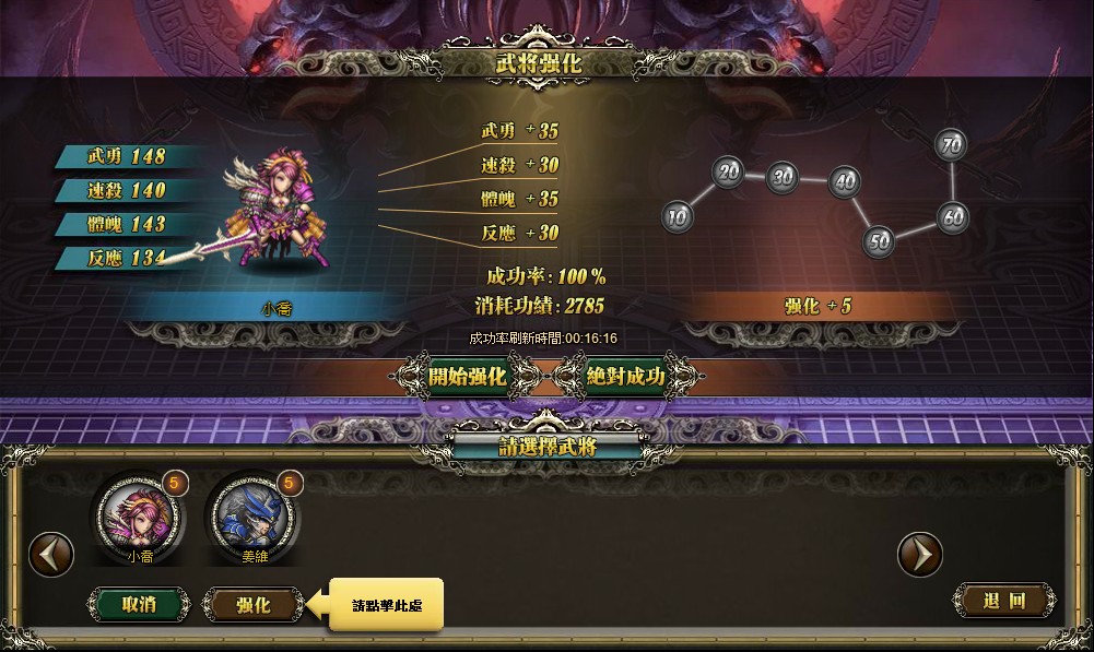 除了修煉升級外也可以利用強化的功能來為武將強化,武將每強化 10 級就能點亮一顆北斗七星,能力會獲得大量的提升,是另一個提升武將強度的好方法。