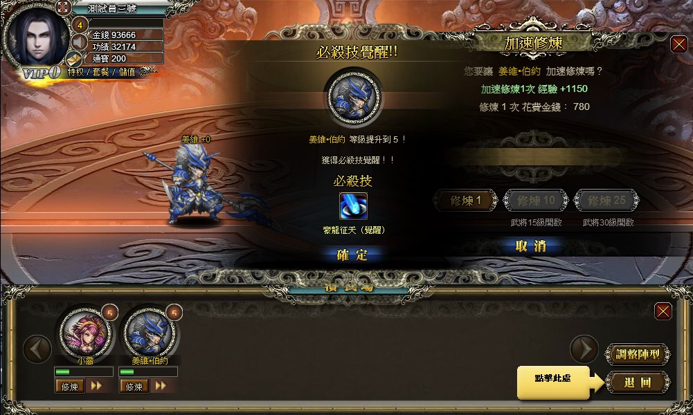 在初期玩家只要主攻武將的修煉跟強化幾乎都可以油輕鬆通過,相對的主城跟校場等級都需要提升起來。此外,較高階的武將修煉到一定等級會覺醒必殺技,在戰鬥時累積怒氣即可使用,技能動畫華麗且攻擊力高,所以遇到有必殺技的武將千萬不要忘了來校場為他們覺醒。