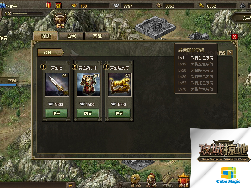 攻城掠地》中添加了很多人性化的設計,點擊「商店」介面的問號,可以查看到裝備開放等級,點擊「酒館」的問號會顯示副本掉落武將的清單。