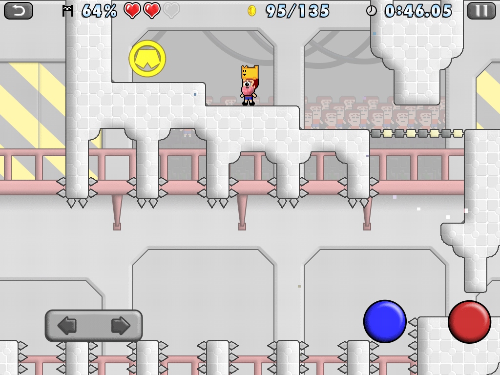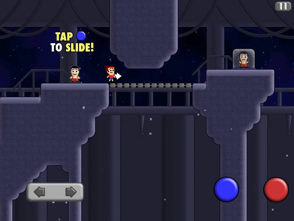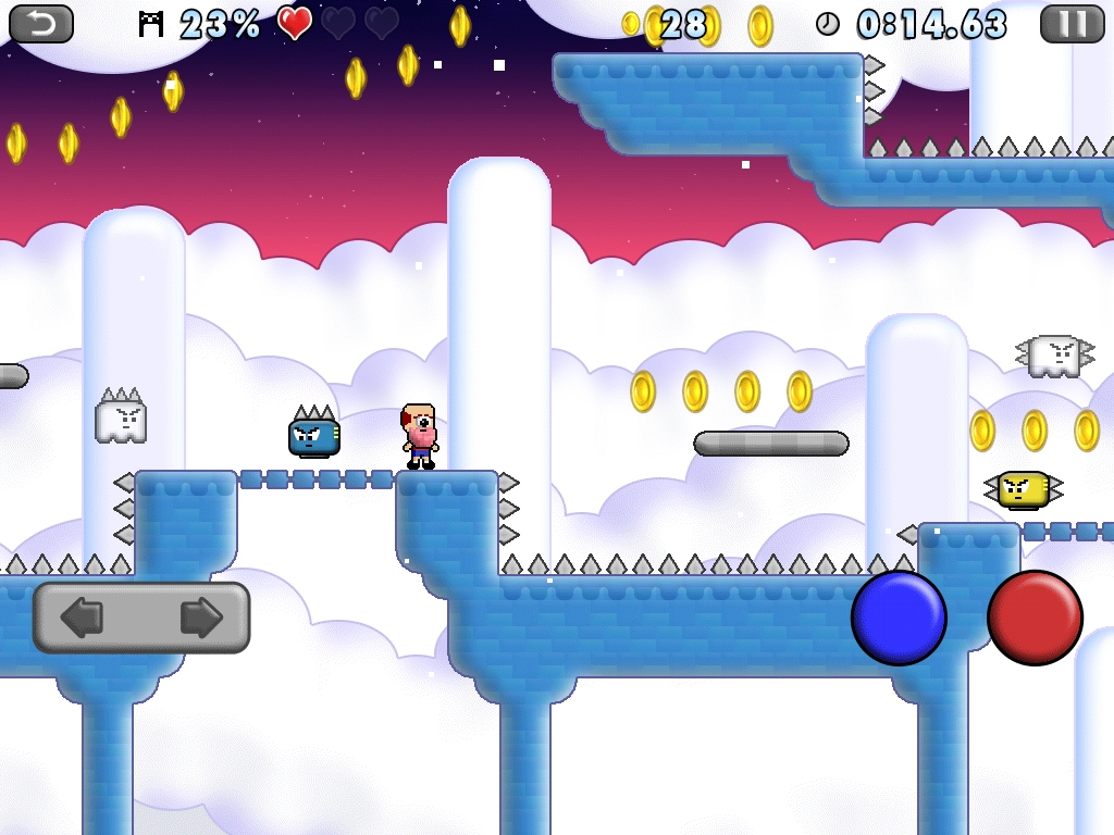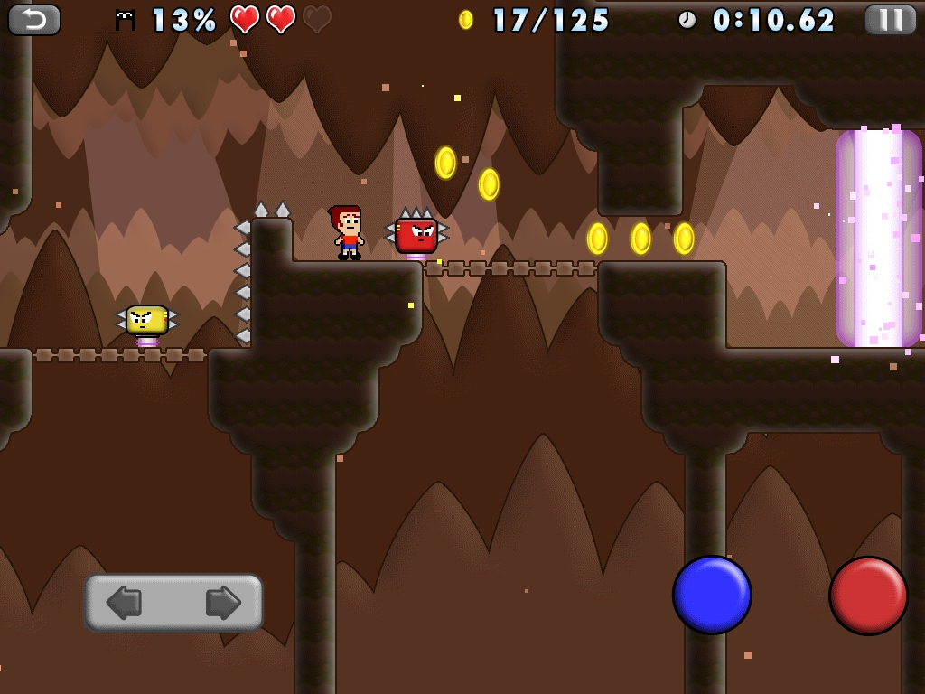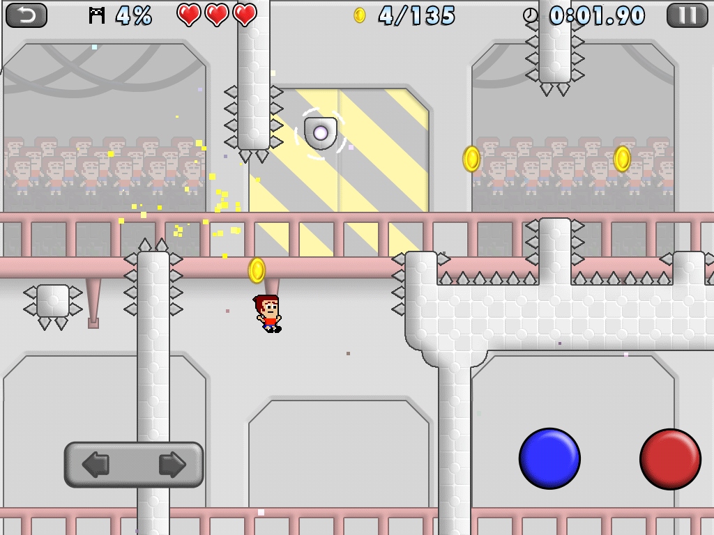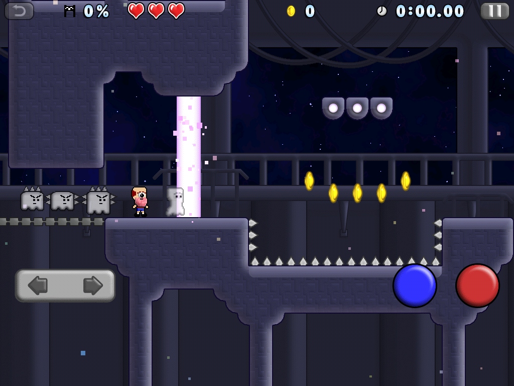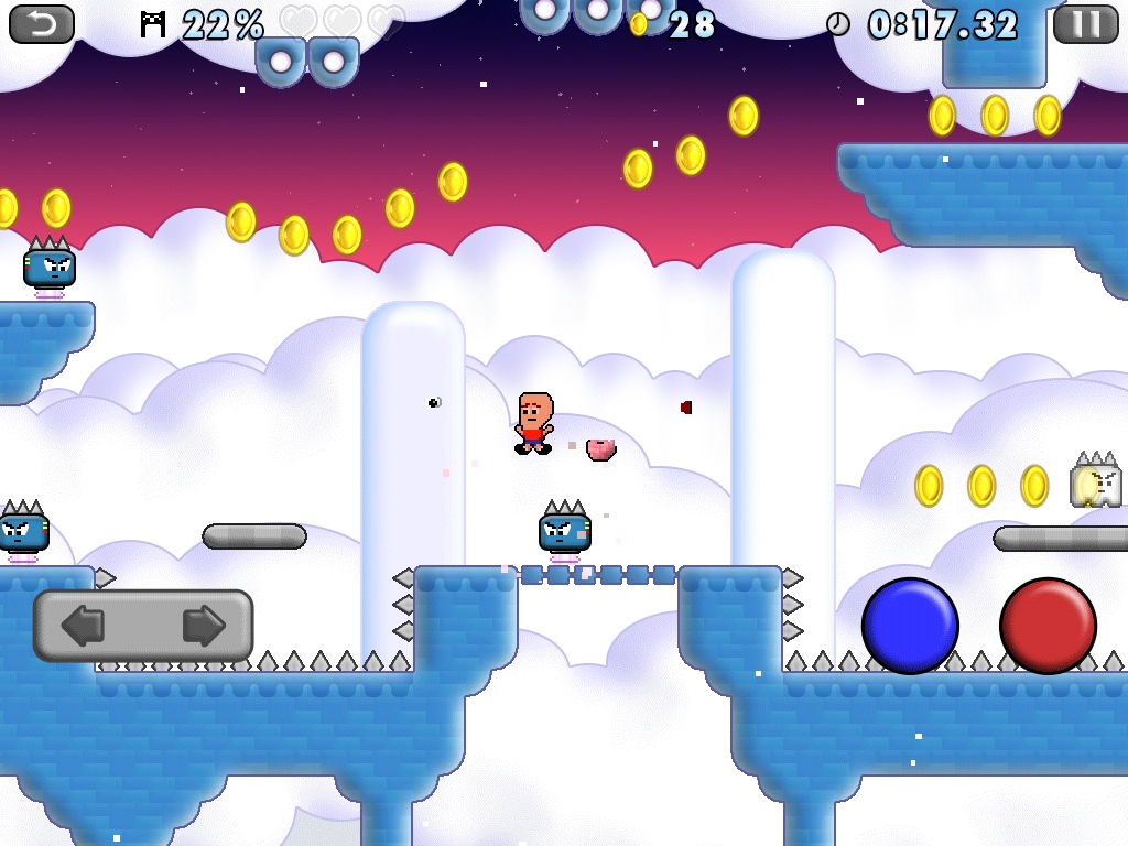 遊戲的按鍵就只有四個,分別是左右移動還有跳躍跟滑行。按著跳躍鍵的時間長短會影響到跳躍的高度和距離,掌握跳躍鍵的時間點才不會因此撞到尖刺,不過這也只是這遊戲要求的操作基本功而已。