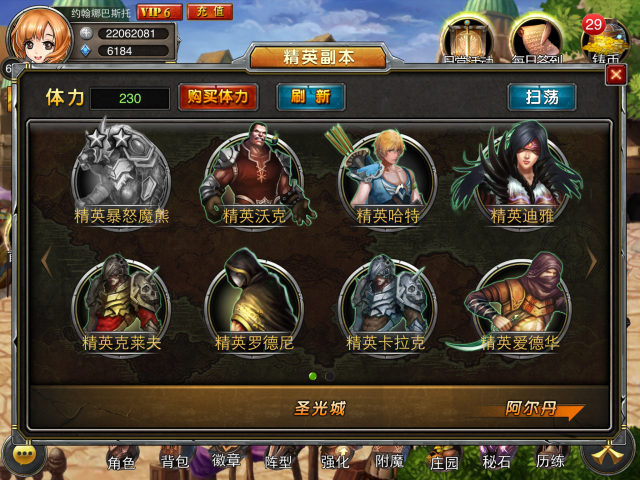 滿足最低23級完成任務暴怒魔熊後將會開啟,精英副本較普通副本難度部份將會有大量提升,同時還有一定幾率獲取卷軸來合成各類裝備。同時還推出掃蕩模式,讓玩家與怪獸面對面PK更加迅速。
