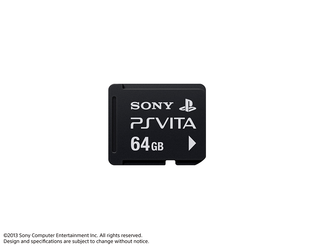 台灣索尼電腦娛樂(SCET)今日宣布推出 PlayStation Vita(PS Vita)專用記憶卡 64GB,為玩家帶來 PS Vita 專用記憶卡產品中最大容量的記憶卡。全新的記憶卡將於 2013 年 10 月 18 日推出,建議零售價為新台幣 2,980 元。PS Vita 玩家可使用這款全新的 PS Vita 專用記憶卡 64GB 來儲存更多遊戲、儲存資料、影片、音樂及相片等。