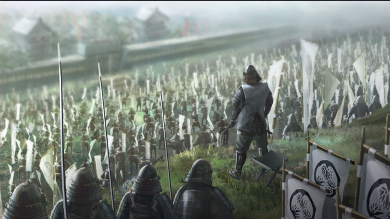 描寫河越夜戰的影片事件其中一幕。這是北条氏康在奇襲敵陣之前,對士兵們號令的場面