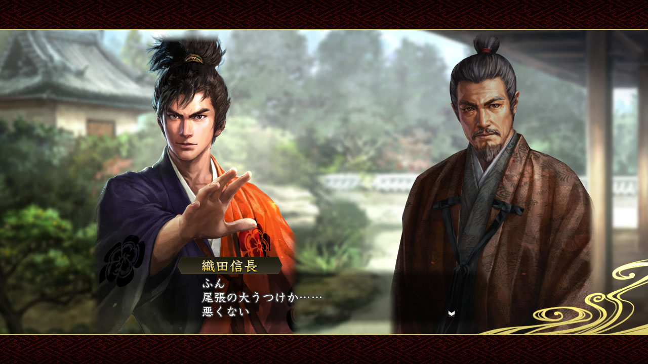 織田信長的父親・信秀死後,與平手政秀對話的場面。政秀擔心信長被稱為尾張的大傻瓜,但信長並不在乎,將視野放在未來。