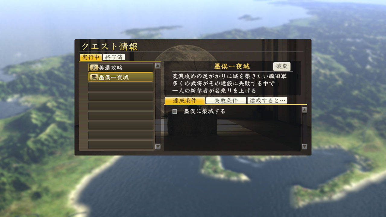 任務情報一覽畫面。會顯示目前發生的任務跟已完成的任務一覽。因為會顯示達成條件以及失敗條件,玩家可配合自己的節奏來進行